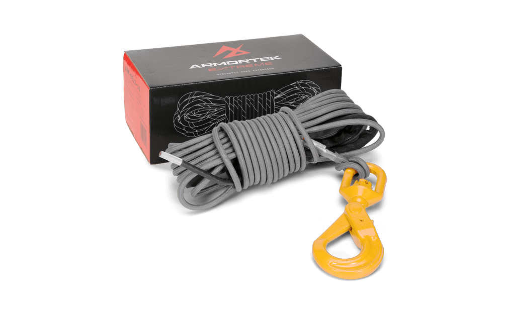 This complete winch rope kit includes a high-strength 3/8" x 50' (9.5mm x 15m) Armortek Extreme Synthetic Rope with an industrial-grade heavy-duty swivel hook, giving you everything you need for safe and reliable winching.