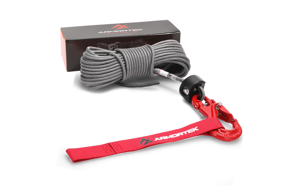 This complete winch rope kit includes a high-strength 13/64" x 50' (5mm x 15m) Armortek Extreme Synthetic Rope, a heavy-duty hook, a rope stopper, and a handsaver strap, giving you everything you need for safe and reliable winching.