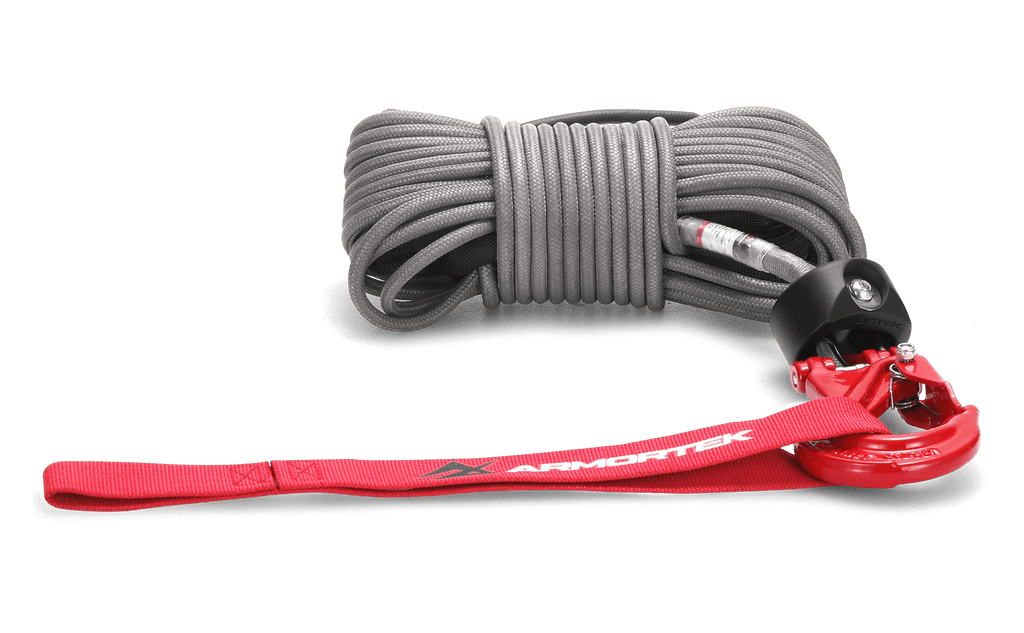 This complete winch rope kit includes a high-strength 15/64" x 50' (6mm x 15m) Armortek Extreme Synthetic Rope, a heavy-duty hook, a rope stopper, and a handsaver strap, giving you everything you need for safe and reliable winching.