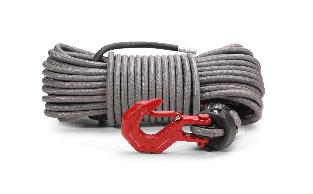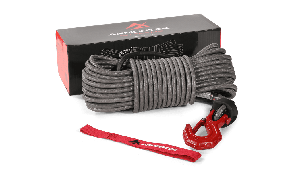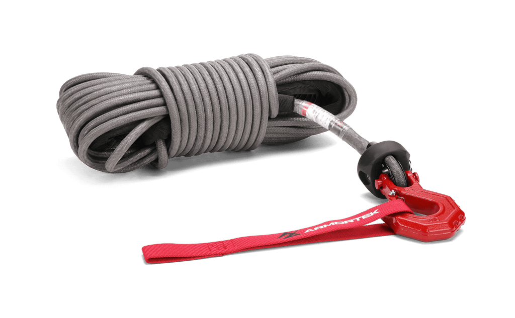 This complete winch rope kit includes a high-strength 7/16" x 82' (11mm x 25m) Armortek Extreme Synthetic Rope, a heavy-duty hook, a rope stopper, and a handsaver strap, giving you everything you need for safe and reliable winching.
